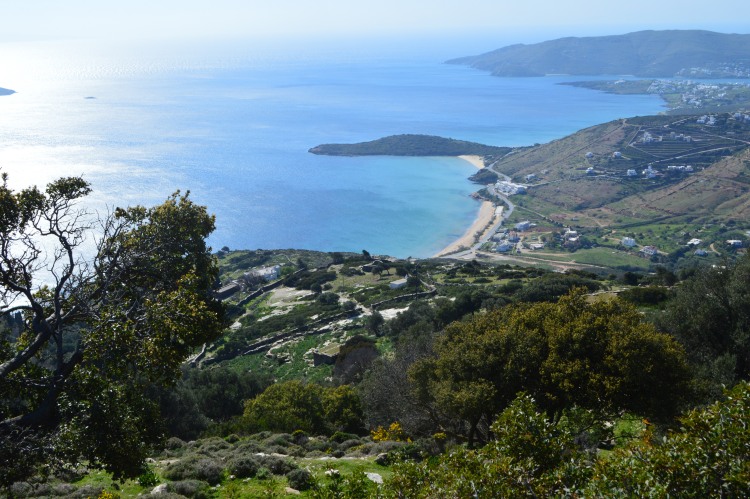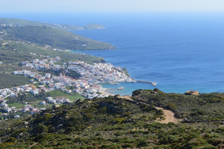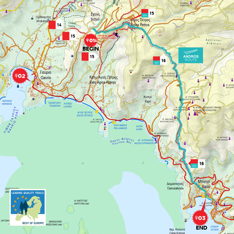 Diese Route bietet einen herrlichen Ausblick auf die Westküste und verschiedene Landschaften. Das malerische Dorf Agios Petros mit seinem eindrucksvollen Hellenistischen Turm und dem Blick auf die Gavrio inseln, die historische, guterhaltene, Klosterburg Agia oder Zoodochos Pighi (Lebenserweckende Quelle), der gepflasterde Steinpfad nach Batsi mit seinem wunderschönen Blick auf Kypri und Batsi sind nur einige der vielen Sehenswürdigkeiten.