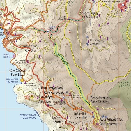 Eine sehr schöne Route, wleche die Routen 11 und 9 verbindet,und damit zwischen die Bucht von Batsi und das Dorf Aprovato. Herrliche gepflasterte Abschnitte, eine reiche Agrarlandschaft und atemberaubende Ausblicke auf die Westküste, während Sie die Hänge des Zentralmassivs von Andros durchqueren.