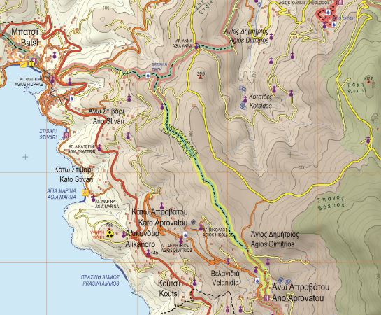 Transport: Laufen Sie entlang der Route 11 von Batsi nach Katakilos, oder mit privaten Verkehrsmitteln zu der Stelle, an der die Route 11 die Asphaltstraße zum Dorf Katakilos verlässt (Rückkehr über dieselbe Route)