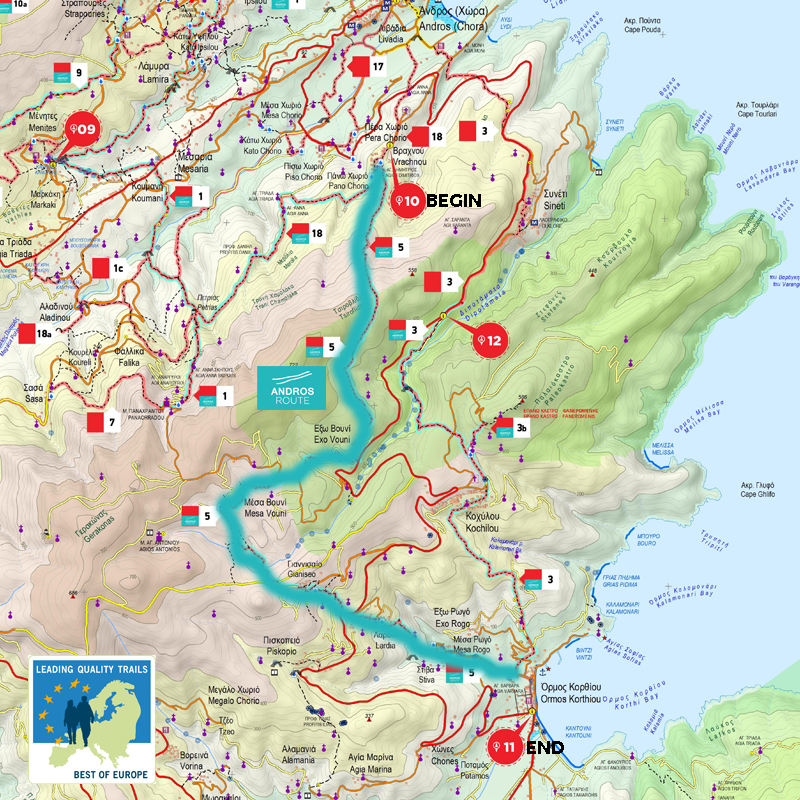 Diese Route erkundet die reiche ehemalige landwirtschaftliche Nutzfläche im zentralen und südlichen Teil von Andros, angesiedelt zwischen den von der Natur reich bedachten Bergketten Gerakonas und Rachi. Einzigartige Siedlungen, abwechselnd rauhes unberührtes und bebautes Land mit immer neuen eindrucksvollen Aussichten über die Berge und die östliche Küstenlinie.