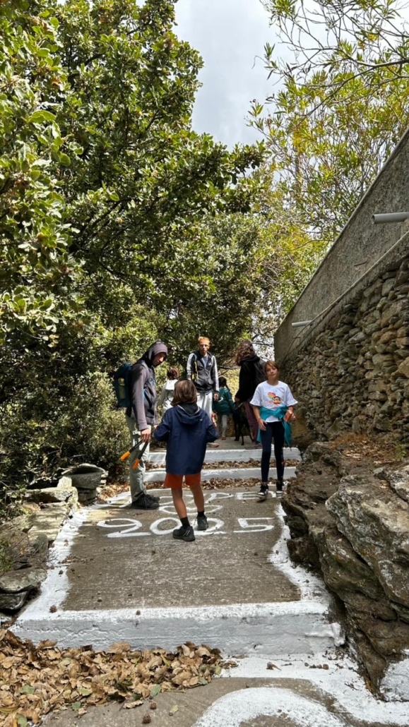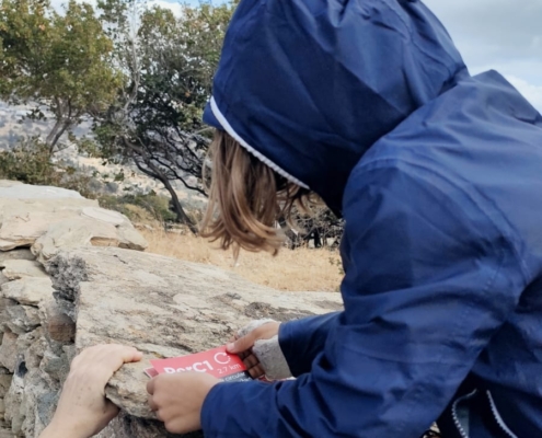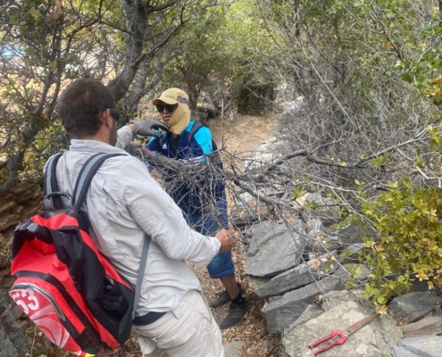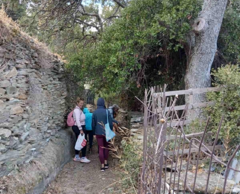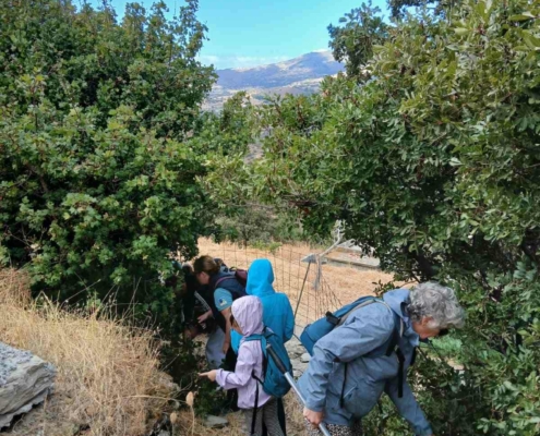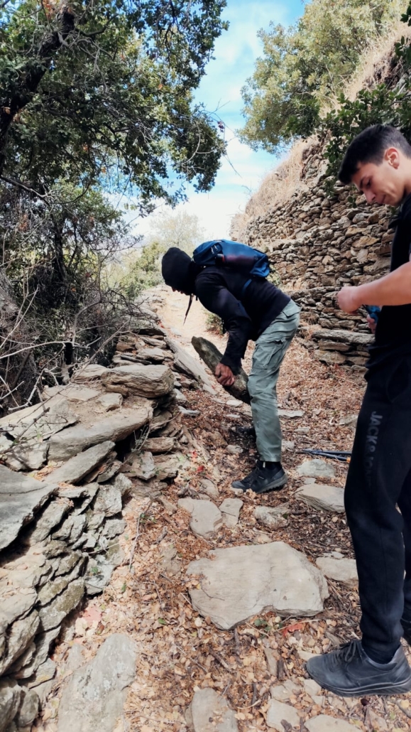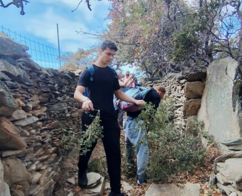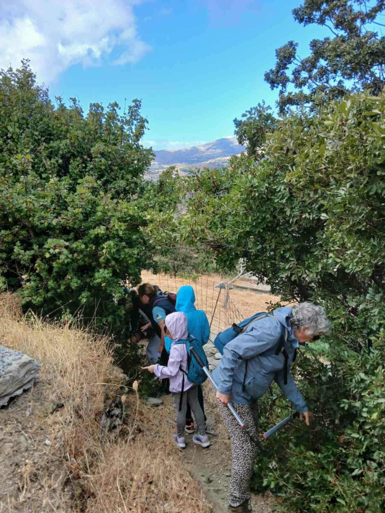 We began our hike with the youngest children leading the way, discovering the path signs and essentially guiding the group. Very soon, we turned onto route 18. As soon as we entered the path, our tools went to work: trimming overgrown vegetation, collecting litter, and replacing fallen stones on the dry stone walls. The children enthusiastically helped pick up trash, checked the path signs, and placed new ones where needed. We then continued via the Pera Choria 2 route (PerC2) to reach our target route, PerC1.