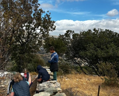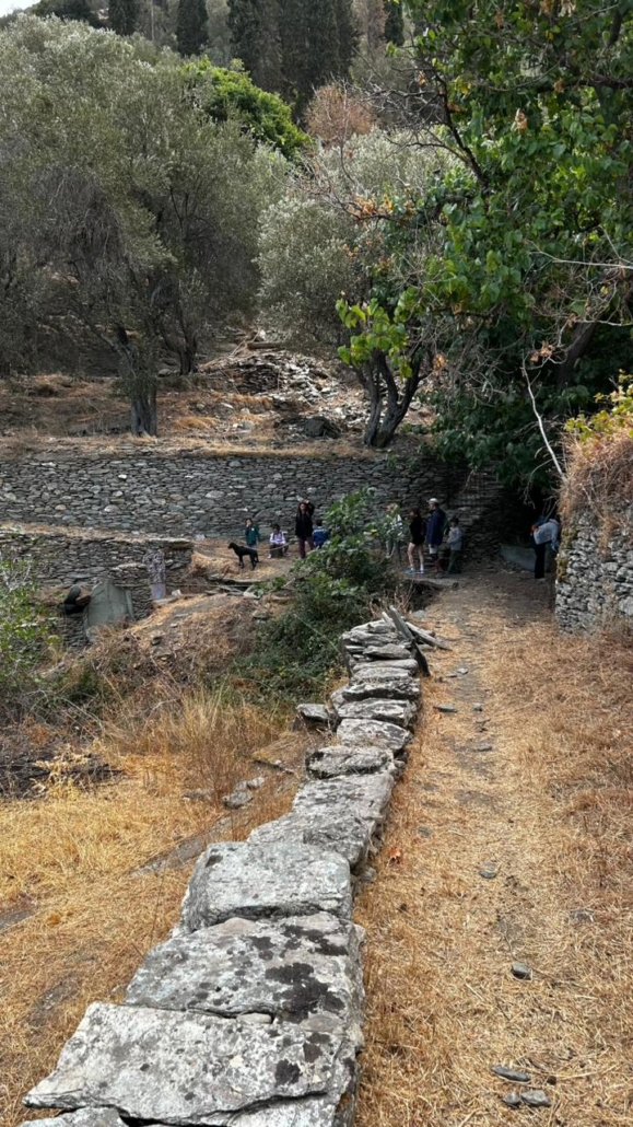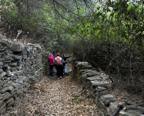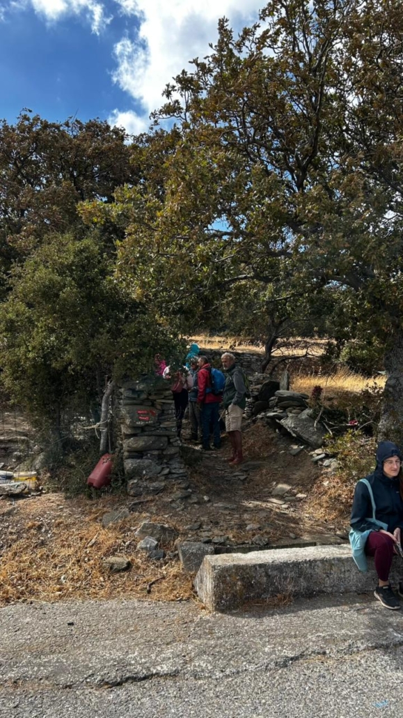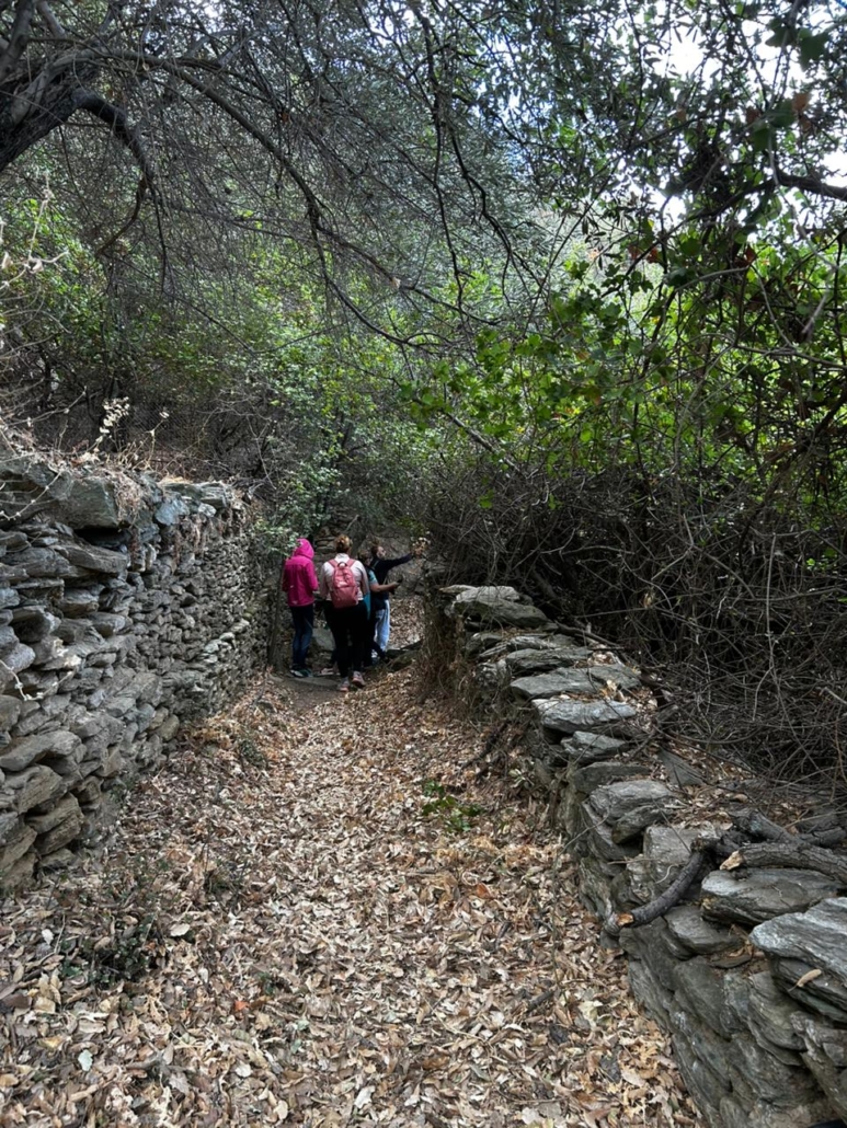We then passed through Koureli and a ravine with structured irrigation channels that once directed water to the terraced fields. Along the way, we encountered the lovely old school of the Pera Choria, with its balcony-like courtyard, and learned that every Easter, locals play “tsounia” there — a game resembling bowling.